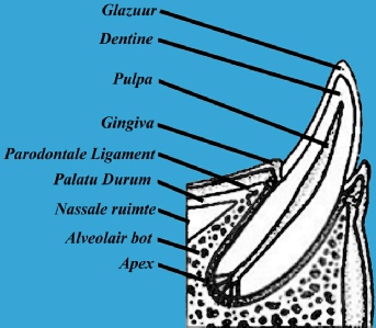 parodontium (dit is het tandvlees, het bot en de structuren waarmee het element verankerd zit). In figuur 1 ziet u een doorsnede van een tand en