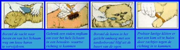 Als U de vacht onvoldoende onderhoudt, krijgt het dier klitten en dat is natuurlijk voor het dier niet zo prettig en zeker ook niet voor de eigenaar. Bovendien een kat die regelmatig gekamd en geborsteld wordt heeft meestal een mooiere vacht dan wanneer men hem niet regelmatig kamt.